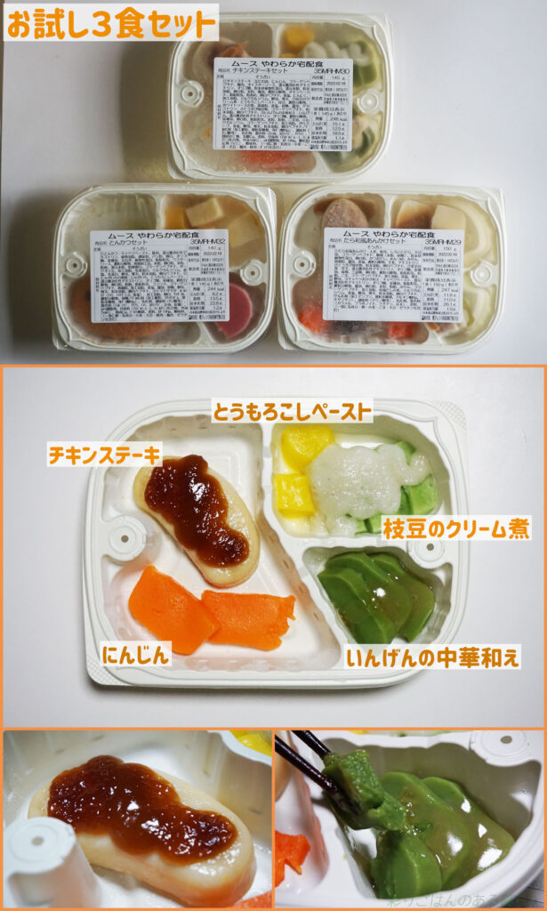 ・以前はムース食だけは3食セットのお試し注文ができた。2025年12月現在は3食セットはなくなってしまったが、またお試しで3食セットが注文できるようになるとなお良い。