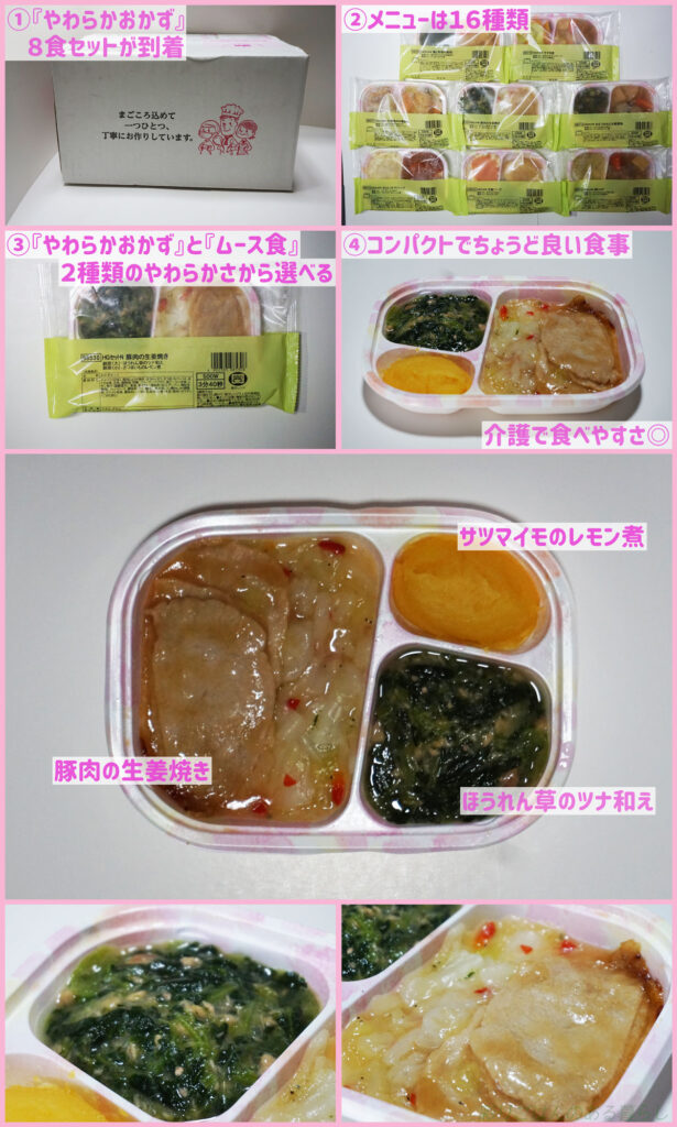 やわらか食だけでも「やわらか減塩食」と「栄養強化食」があって、目的と好みで選べるのもポイント。
